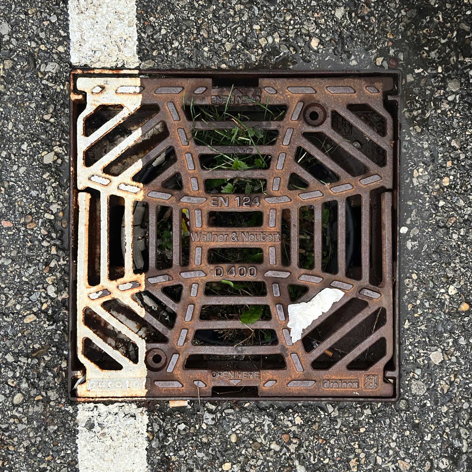 Am Parkplatz des Hornbachs, wo einst Waagner-Biró Kanaldeckel gegossen wurden, liegt nun ein Purator-Deckel von Wallner & Neubert. Ein stiller Thronwechsel – teils weiß überpinselt von der Parkplatzmarkierung.